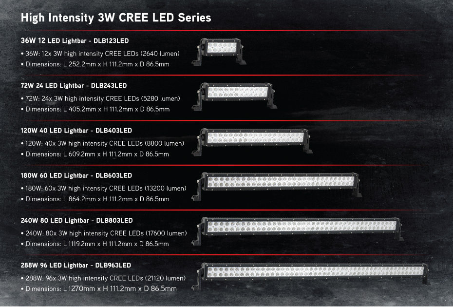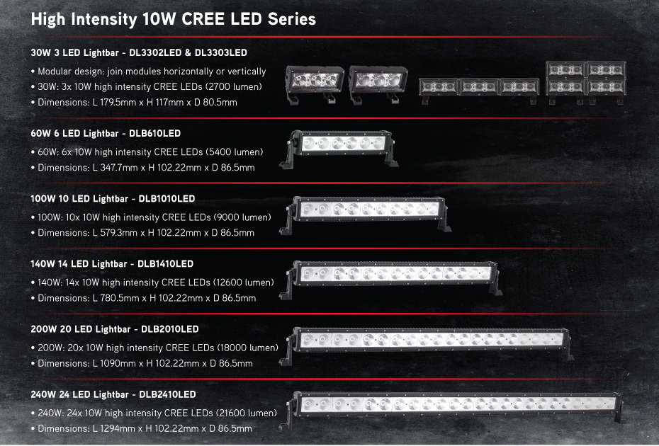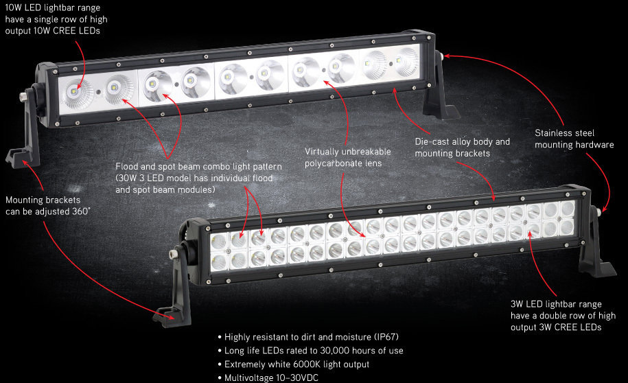 Built tough with die-cast alloy housings, stainless steel mounting hardware, and virtually unbreakable polycarbonate lenses, the off-road LED lightbar range comes in a wide variety of lengths and lumen outputs. Available in either a single row of 10W CREE LEDs for more directional light, or a double row of 3W CREE LEDs for the ultimate wide spread.